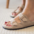 A rasteira Nanda é estilo Birken comfy é feita em couro Nobuck e forrada em couro pêlo teddy, deixando a peça puro conforto para o seu dia a dia. O solado é feito de borracha ideal para garantir o conforto e fivelas ajustáveis na mesma cor do Nobuck